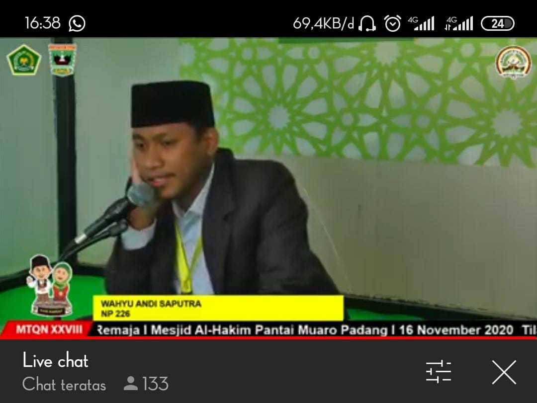 Padang (Humas) Wahyu Andi Saputra, peserta cabang tilawah remaja putra asal Provinsi Kalimantan Tengah dijadwalkan tampil di babak final Musabaqah Tilawatil Quran (MTQ) tingkat nasional di Kota Padang, Provinsi Sumatera Barat, Kamis (19/11/2020) siang.